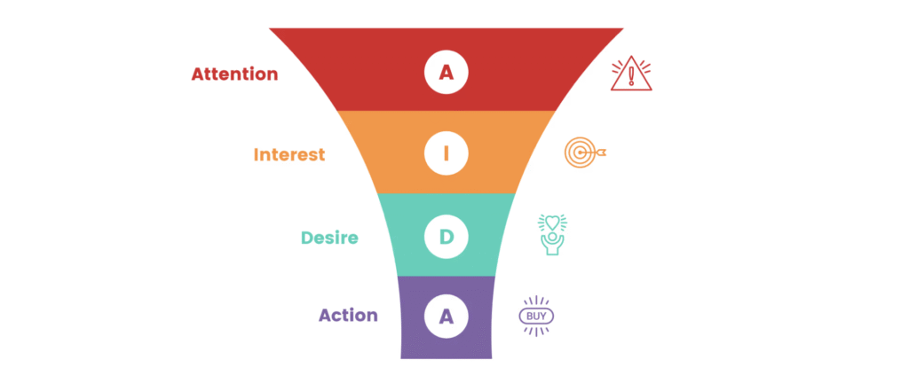 AIDA står for Attention (opmærksomhed), Interest (interesse), Desire (ønske) og Action (handling). Disse fire bogstaver repræsenterer de sekventielle faser, en potentiel kunde gennemgår i købsprocessen. Attention handler om at fange opmærksomhed i et overfyldt marked. Interest handler om at skabe engagement og nysgerrighed. Desire handler om at transformere interesse til et aktivt ønske om at købe. Action handler om at facilitere selve købet eller konverteringen.
